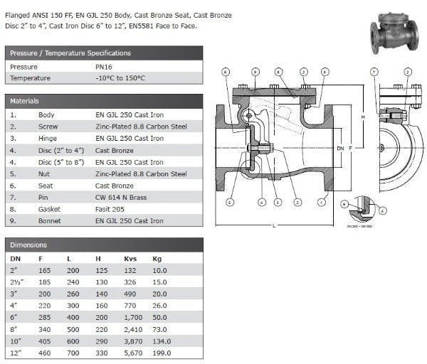 Flanged ANSI 150 FF, EN GJL 250 Body, Cast Bronze Seat, Cast Bronze Disc 2″ to 4″, Cast Iron Disc 6″ to 12″. EN 558-1 Face to Face. Rated PN16 Temperature -10ºC to 150ºC. *This...