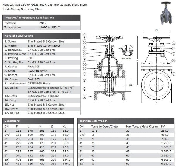 Flanged ANSI 150 FF, GG25 Body, Cast Bronze Seat, Brass Stem, Inside Screw, Non-rising Stem Rated PN16 Temperature -10°C to 150°C. *This product is specially ordered in, please email to request a stock check and...