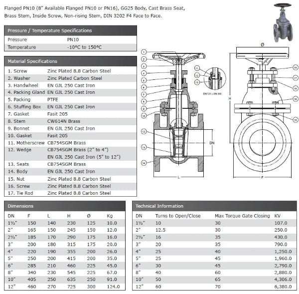 Flanged PN16 (8” Available Flanged PN10), GG25 Body, Cast Brass Seat, Brass Stem, Inside Screw, Non-rising Stem, DIN 3202 F4 Face to Face Rated PN10 Temperature -10°C to 120°C. *Some products may have to be...
