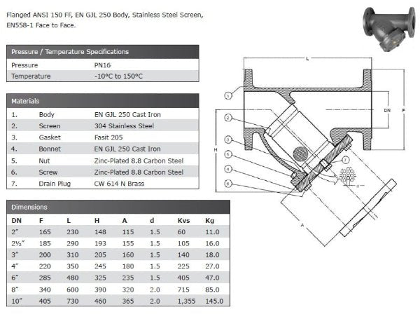 Flanged ANSI 150 FF, EN GJL 250 Body, Stainless Steel Screen, EN 558-1 Face to Face. Rated PN16 Temperature -10ºC to 150ºC. *This product is specially ordered in, please email to request a stock check:...
