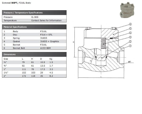 Screwed BSPT, F316L Stainless Steel Rated class 800. *These valves may need to be ordered in, please email to enquire and request a stock check.