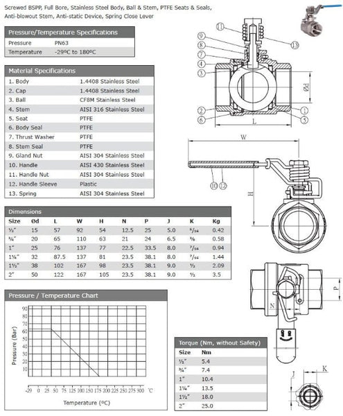 Screwed BSPP, Full Bore, Stainless Steel Body, Ball & Stem, PTFE Seats & Seals, Anti-blowout Stem, Anti-static Device, Spring Close Lever. ATEX. Rated PN63 Temperature -29°C to 180°C.