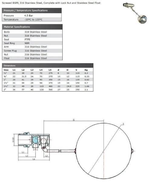 Screwed BSPP, 316 Stainless Steel, Complete with Lock Nut and Stainless Steel Float. Rated 4.5 Bar Temperature -10ºC to -120ºC