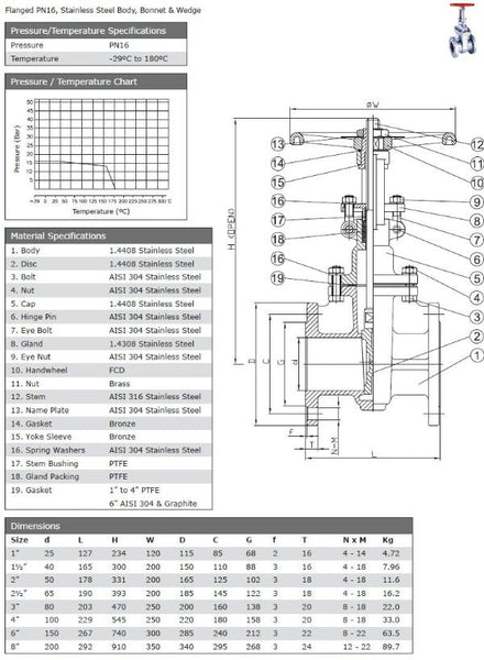 Flanged PN16, Stainless Steel Body, Bonnet & Wedge, Rising Stem, Handwheel Operation. Rated PN16 Temperature -29°C to 180°C. *These valves may need to be ordered in, please email to enquire and request a stock check:...