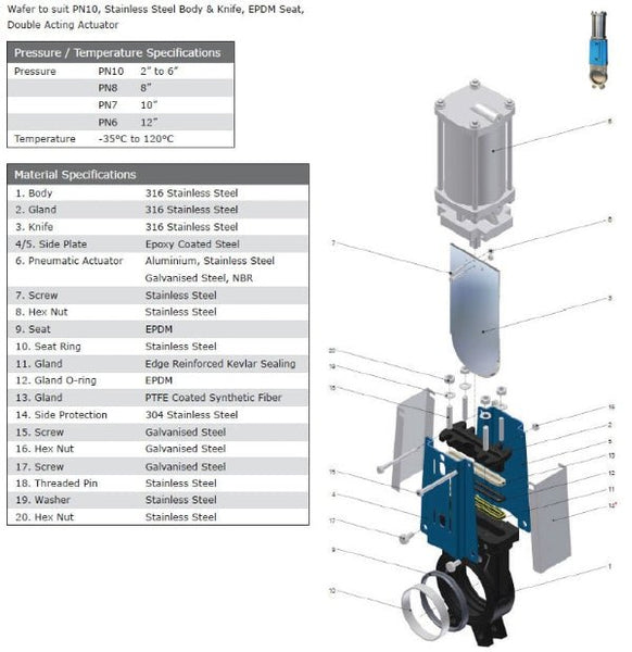 Wafer to suit PN10, Stainless Steel Body & Knife, EPDM Seat, Double Acting Actuator. Rated PN10 2” to 6” PN8 8” PN7 10” PN6 12” Temperature -35°C to 120°C. *These valves are specially ordered in,...