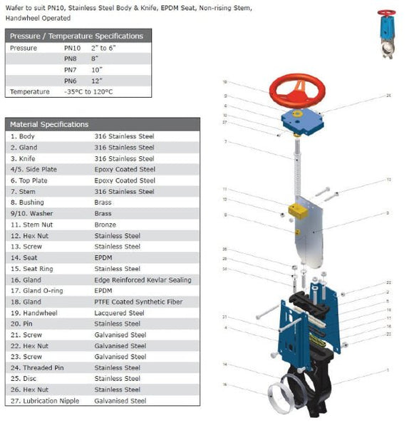 Wafer to suit PN10, Stainless Steel Body & Knife, EPDM Seat, Handwheel Operated. Rated PN10 2” to 6” PN8 8” PN7 10” PN6 12” Temperature -35°C to 120°C. *These valves are specially ordered in, please...